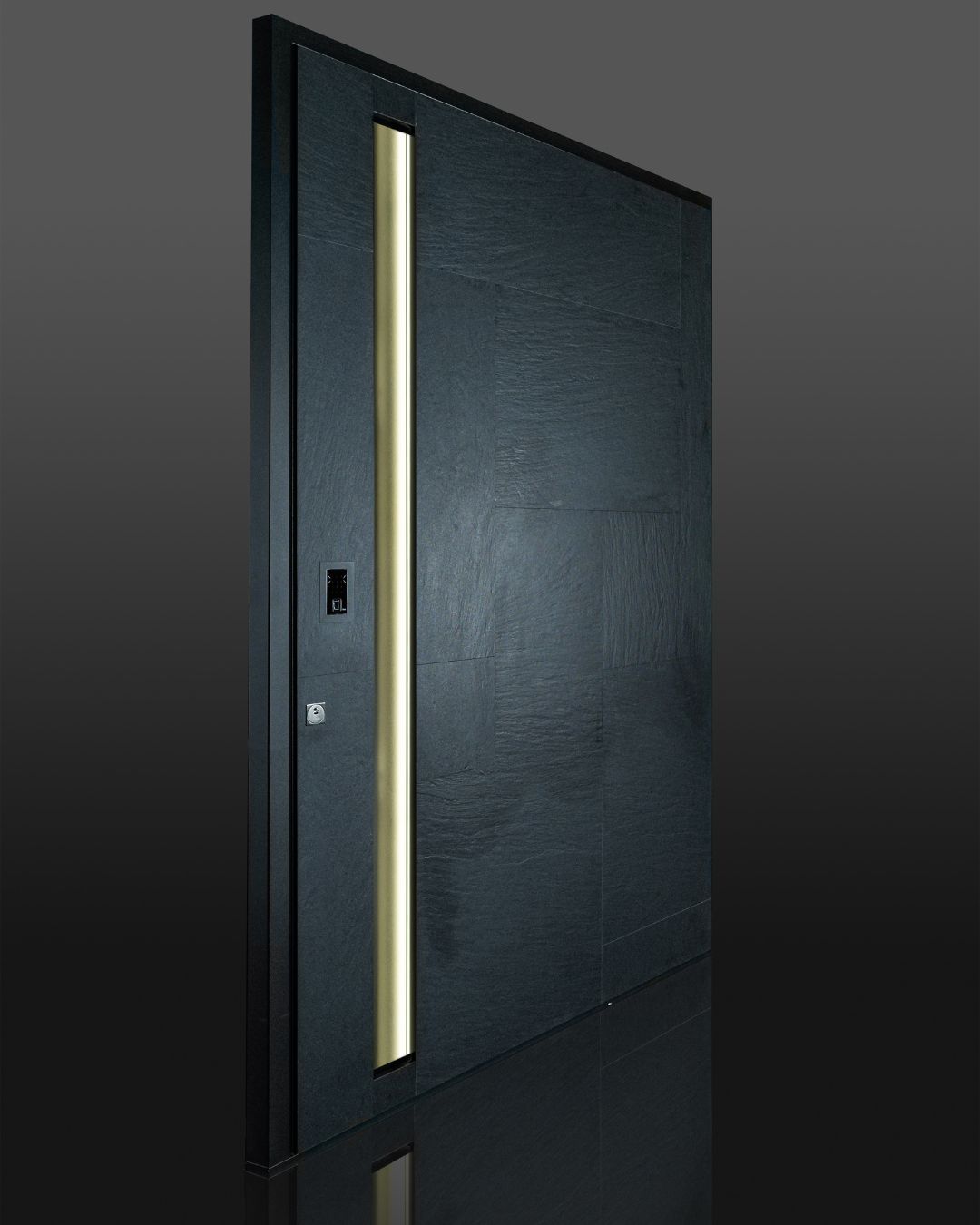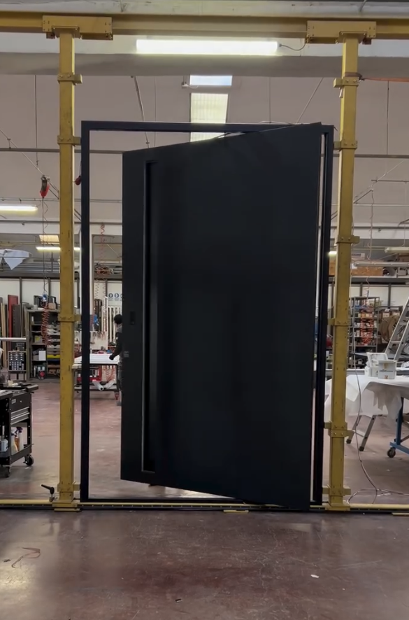 La porta protagonista di questo progetto è una porta blindata pivotante dalle dimensioni imponenti – 1,8 metri di larghezza per 2,9 metri di altezza – con apertura totale e fluida.